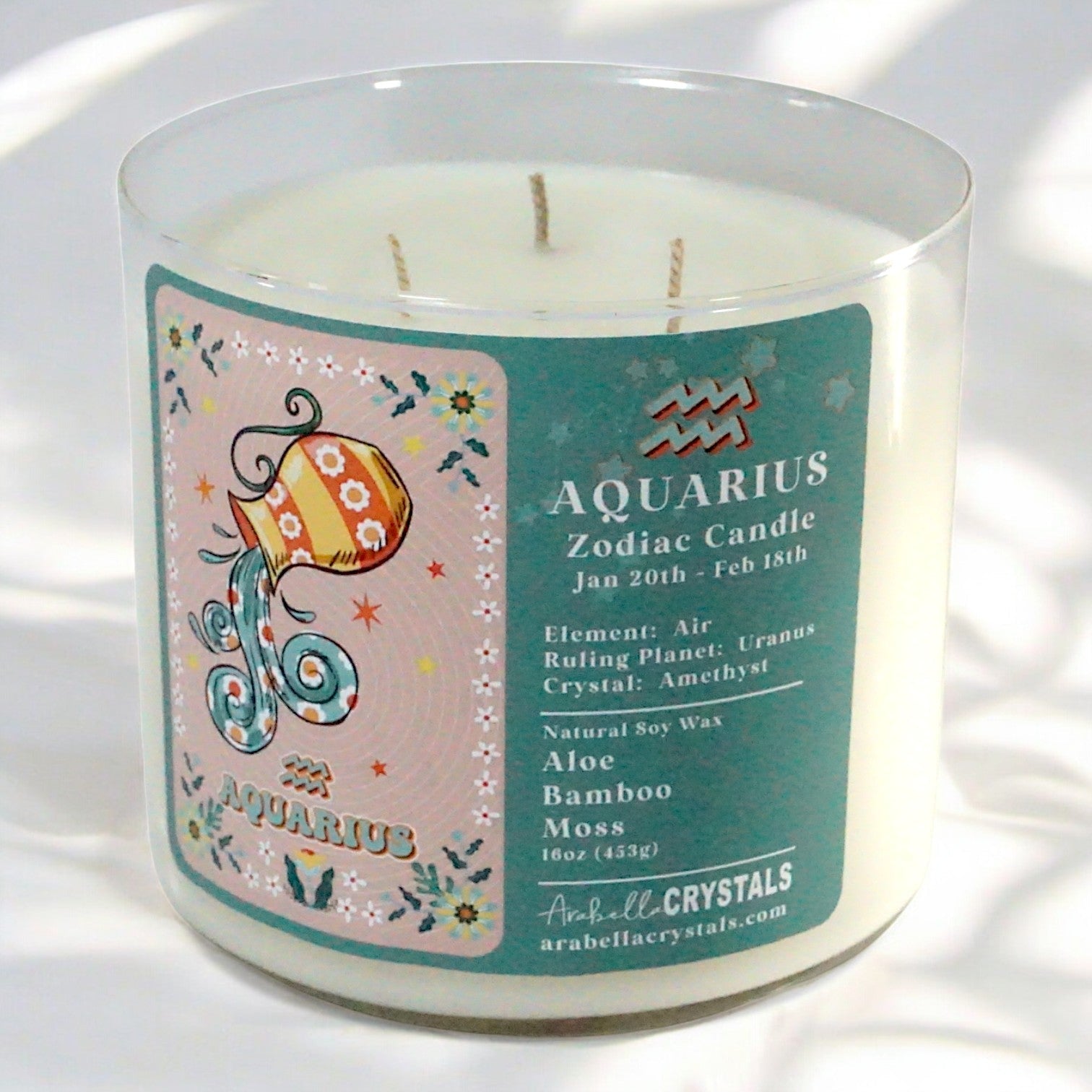 Celebrate your cosmic energy with our Aquarius Zodiac Candle, a perfect tribute to the Water Bearer, the visionary who seeks to bring change to the world. Just as Aquarius is known for its humanitarian spirit and progressive ideals, this candle channels those same forces of transformation and empowerment. Infused with Amethyst, a crystal of spiritual awakening, and scented with the fresh, revitalizing blend of Aloe, Bamboo, and Moss, this candle is designed to uplift your energy, clear your mind, and enhance your connection to the divine.