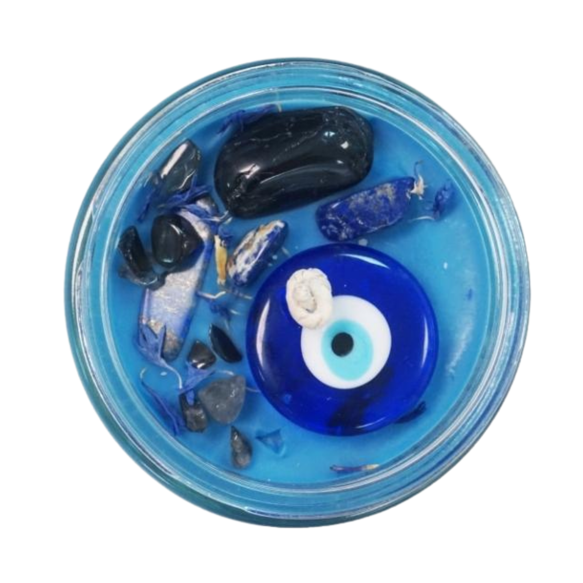 - Glass Evil Eye Pendant Charm – Tied to the wick for added protection, this pendant serves as a visual reminder of the evil eye's protective power. Important: Remove the pendant before burning to avoid damage from heat. Simply trim the wick and safely remove the charm before lighting your candle.