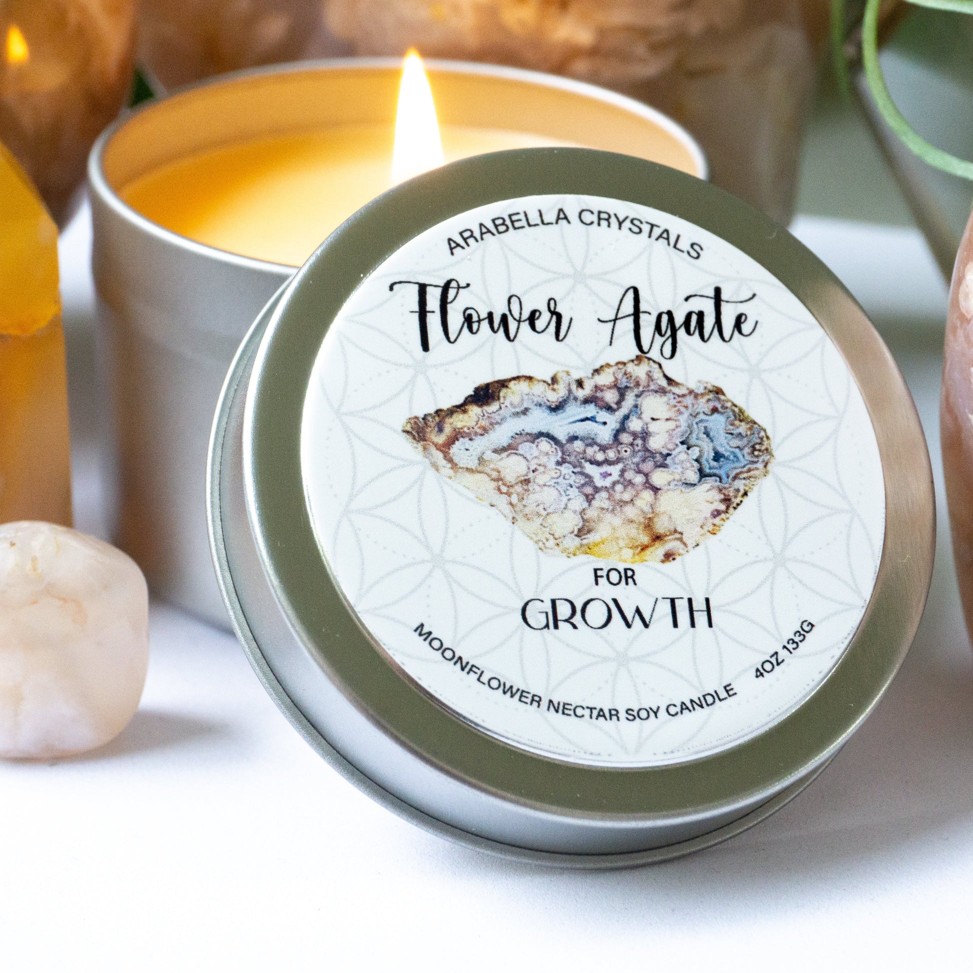 Unleash your inner growth and manifest your dreams with our Flower Agate Crystal Candle, infused with the delicate, captivating scent of Moonflower Nectar. Inspired by the ethereal fragrance of the night-blooming moonflower, this vegan-friendly candle offers a soothing yet uplifting experience. Whether you're working on emotional healing, personal growth, or nurturing your dreams, this crystal-infused candle creates a peaceful atmosphere that enhances your intentions.