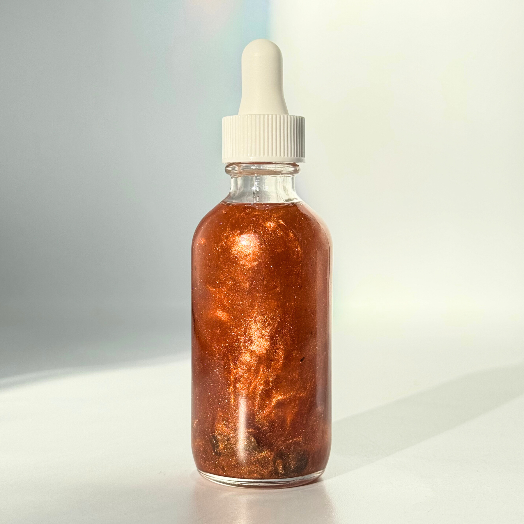 Get ready to glow like never before - our Palo Santo Shimmer Oil is a powerhouse for your skin. Made with sunflower oil for deep hydration, vitamin e rich jojoba oil, and grapeseed oil for balancing skin tone. This magical little bottle will leave your skin feeling supple and nourished. Plus, biodegradable glitters add a touch of whimsy and sparkle, while energizing crystals and a delicate fragrance complete the experience. It's skin care with a side of shimmer.