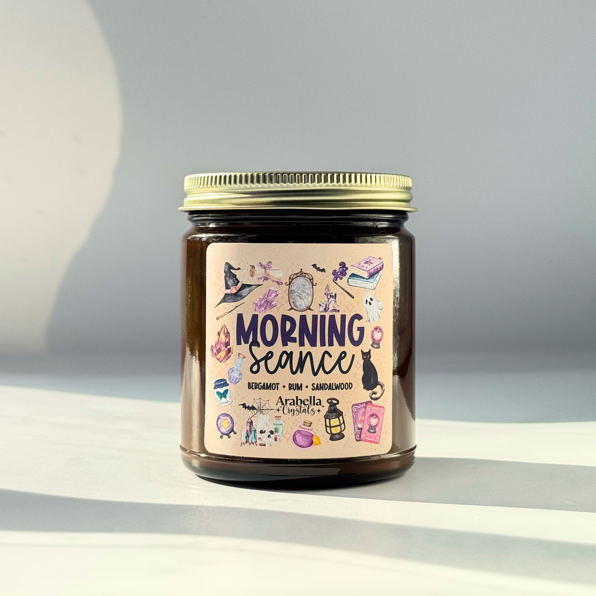 Whispers stir at dawn, incense curls in the chill air, and the veil between worlds grows thin. Morning Séance is a spellbinding candle crafted for those who commune with spirit, seek sacred quiet, and walk the line between shadow and light. With a moody blend of bergamot, dark rum, and smoky sandalwood—and a hidden Amethyst crystal inside—this candle invites deep intuition, psychic connection, and soul-centered stillness.