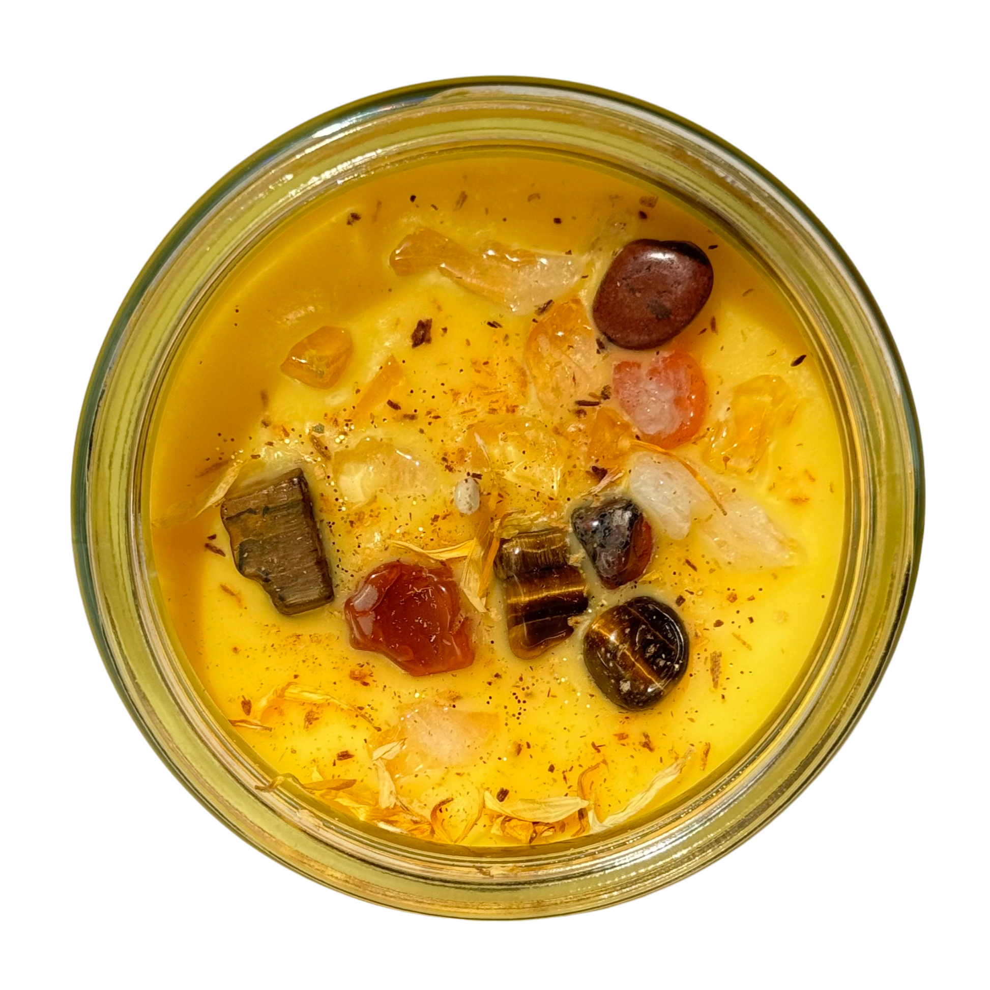 Awaken your inner radiance and shine brightly with our Golden Glow Candle, designed to empower you with the energy of success, abundance, and positivity. Infused with the invigorating scent of Orange Blossom and healing properties of Citrine, Tiger's Eye, and Carnelian Agate, this candle helps you rise to your full potential, drawing in warmth, courage, and vitality. Let the energy of the sun light your path, fill your space, and ignite your passion.