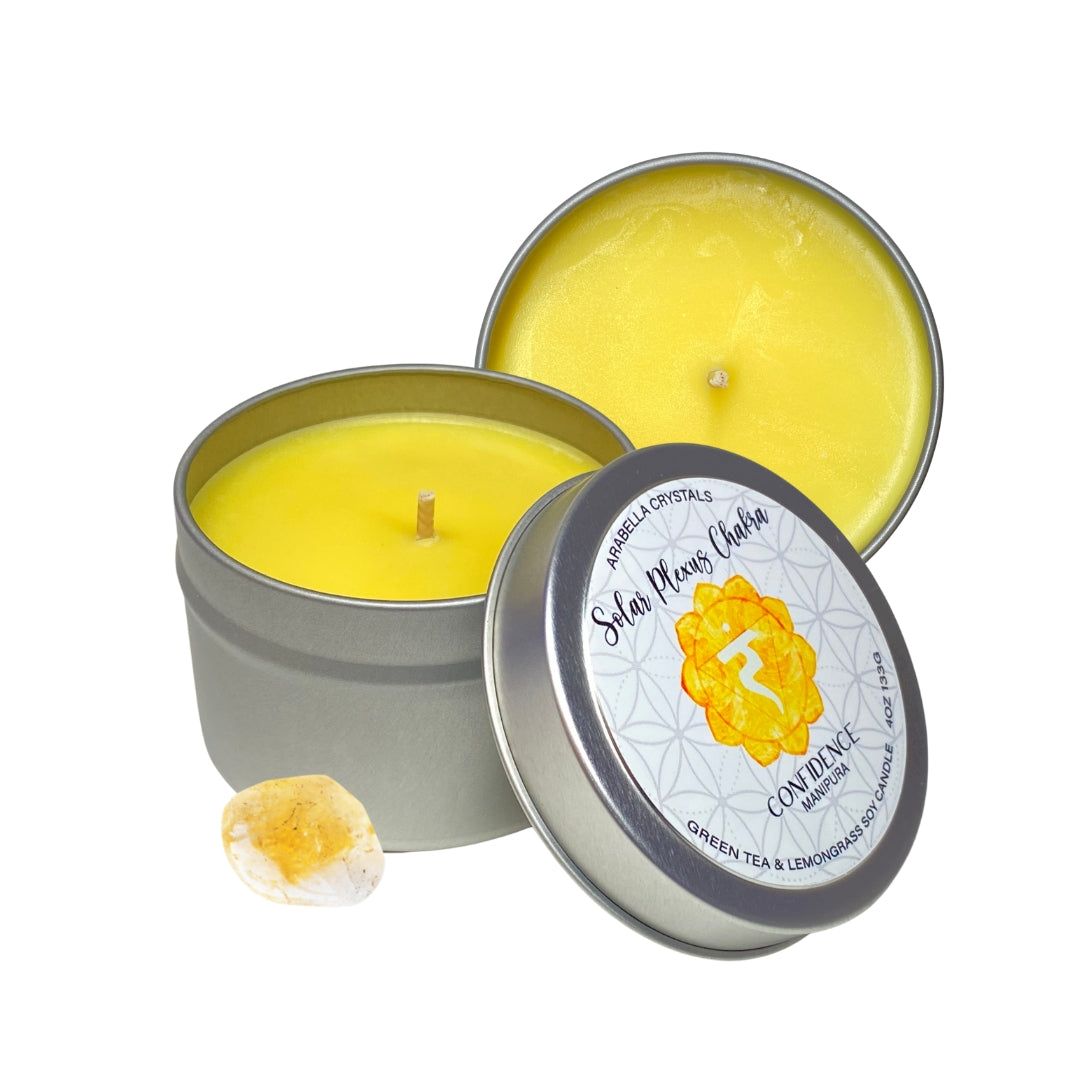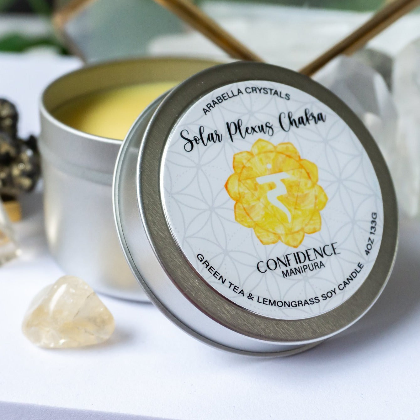 Empower yourself and ignite your inner fire with our Solar Plexus Chakra Candle, designed to awaken and energize your personal power, confidence, and will. Infused with the refreshing and vibrant scents of Green Tea, Lemongrass, and Citrine, this candle is crafted to support your Solar Plexus Chakra, helping you tap into your fullest potential and radiate positive energy.